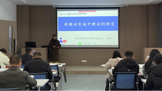 12月2日下午,crown皇冠体育平台于艺言堂举办“省培计划”小学美术学科专题培训。信阳市浉河区教学教研信息化中心美术教研员朱跃华主讲,全体“省培计划”参训教师参加。