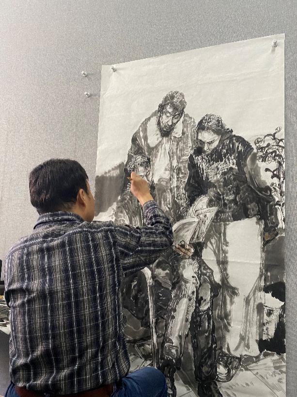 袁汝波教授进行现场示范,以直观的方式给大家讲解在写生与创作过程中该如何处理画面。他指出,起形要大块,抓住对象的主体特征,不能是客观的描摹,而是要主观地提炼和取舍。并强调平时多练习速写有助于创作。着墨时要讲究笔墨特色,浓淡干湿对比。加强人与人之间的关系,在不影响整体的情况下,通过主观渲染,做到统一整体和协调统一。